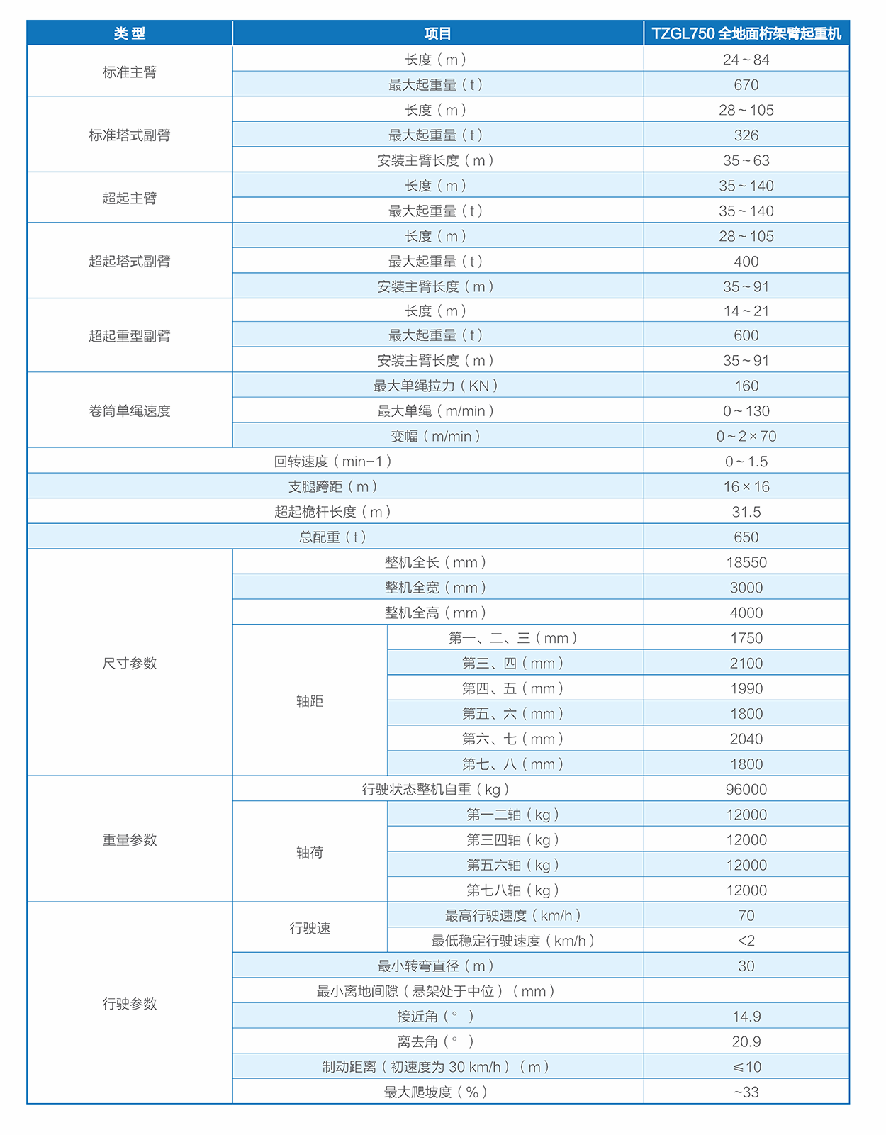 TZGL750全地面桁架臂起重機是國內(nèi)首創(chuàng)機型,集桁架臂的超強起重能力與全地面底盤的快速轉(zhuǎn)場特點于一身,可廣泛應用于風電建設、橋梁建設、石油化工、市政工程等吊裝領域。