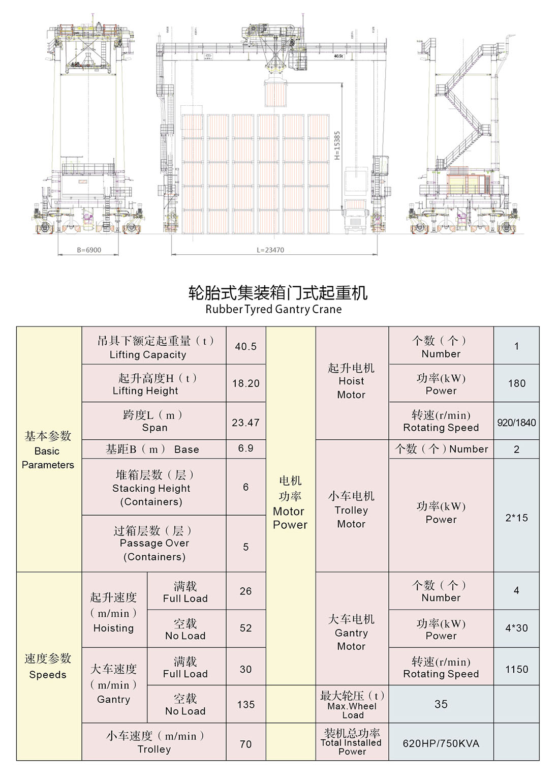 簡稱輪胎式場橋,是集裝箱碼頭堆場或集裝箱貨場進(jìn)行堆碼作業(yè)的專用裝卸機(jī)械,主要由起升機(jī)構(gòu)、小車行走機(jī)構(gòu)、大車行走機(jī)構(gòu)組成。包含兩個(gè)U型門框與底梁組成門式架,支承在充氣橡膠輪胎上,可在規(guī)定的行車通道上行走??砂礉L裝發(fā)運(yùn)的方式向客戶提供所需的輪胎式集裝箱門式起重機(jī)。