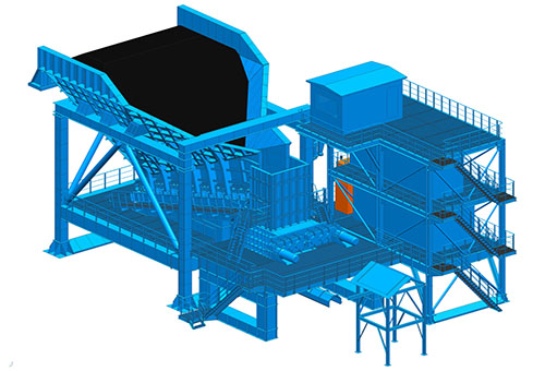 雙齒輥半移動(dòng)破碎站用于千萬噸級以上大型露天礦原煤及剝離物的初級破碎,其開采工藝一般為單斗挖掘機(jī)—運(yùn)輸汽車—半移動(dòng)破碎站—膠帶機(jī)。利用汽車運(yùn)輸?shù)撵`活性,縮短了汽車運(yùn)距,又發(fā)揮了帶式輸送適用于長距離運(yùn)輸、生產(chǎn)率高、成本低、維護(hù)量小、安全可靠的特點(diǎn),同時(shí)可隨開采推進(jìn)定期遷移,機(jī)動(dòng)靈活。