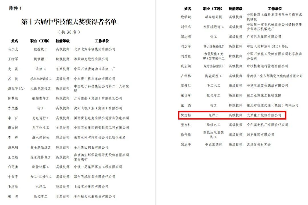 近日,第十六屆“中華技能大獎”和“全國技術(shù)能手”名單出爐!全國僅30名中華技能大獎獲得者,太重集團高級技師樊志勤榜上有名,也是獲此殊榮的第一位太重人!衷心祝賀喜獲殊榮!