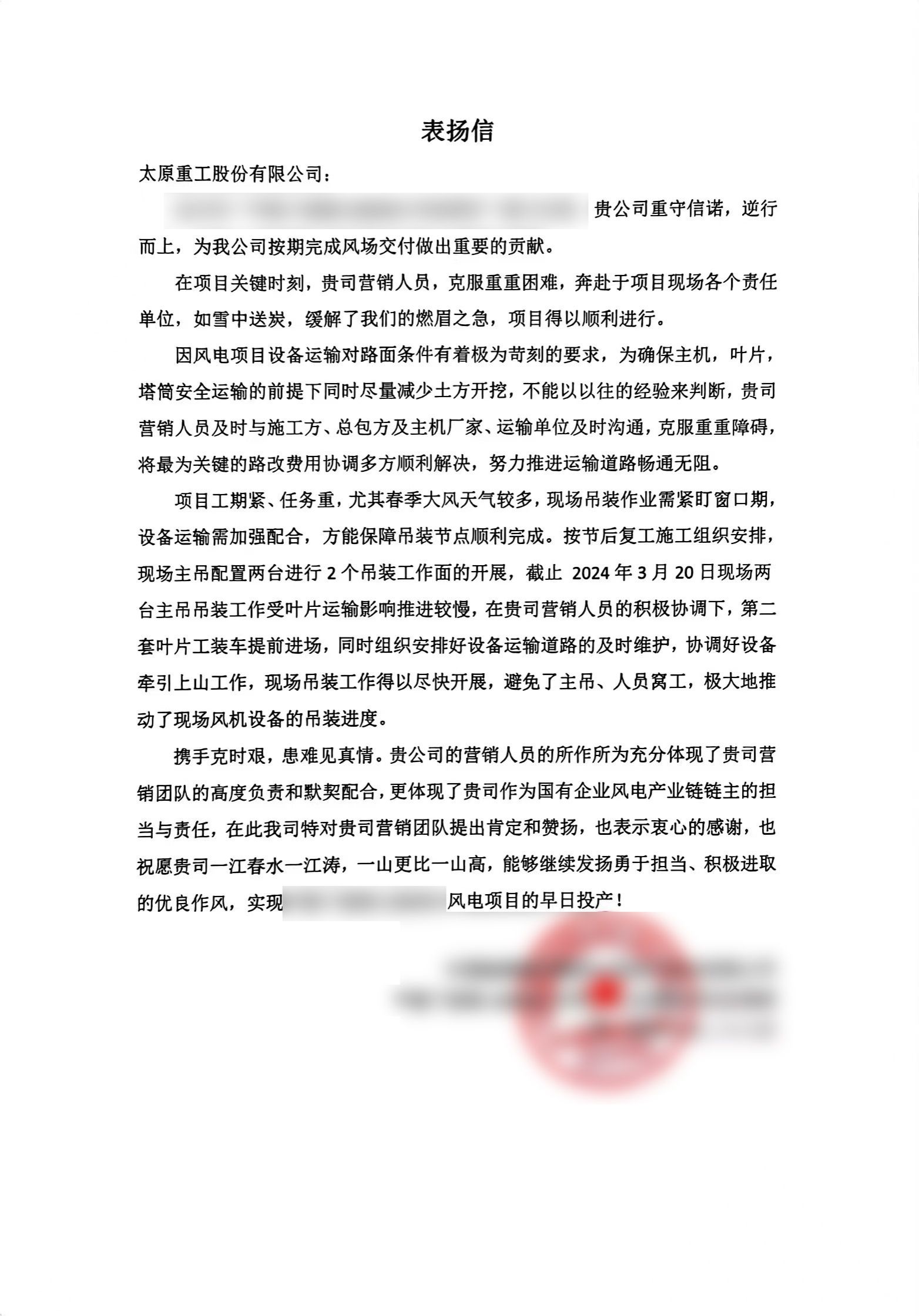 盡管項(xiàng)目還未完工,但用戶(hù)已經(jīng)從細(xì)節(jié)中感受到了太重深耕風(fēng)電領(lǐng)域的態(tài)度,信中特別提到: