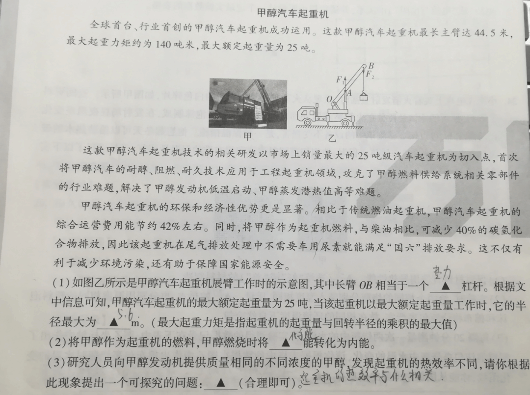 全球首臺、行業(yè)首創(chuàng)的太重甲醇汽車起重機(jī)投入使用后,人民日報、人民網(wǎng)、科技日報等國家、省級權(quán)威媒體高度關(guān)注、紛紛報道。今天我們的這款25噸甲醇汽車起重機(jī)——TZGT25M也出現(xiàn)在初三學(xué)生的物理考卷上。