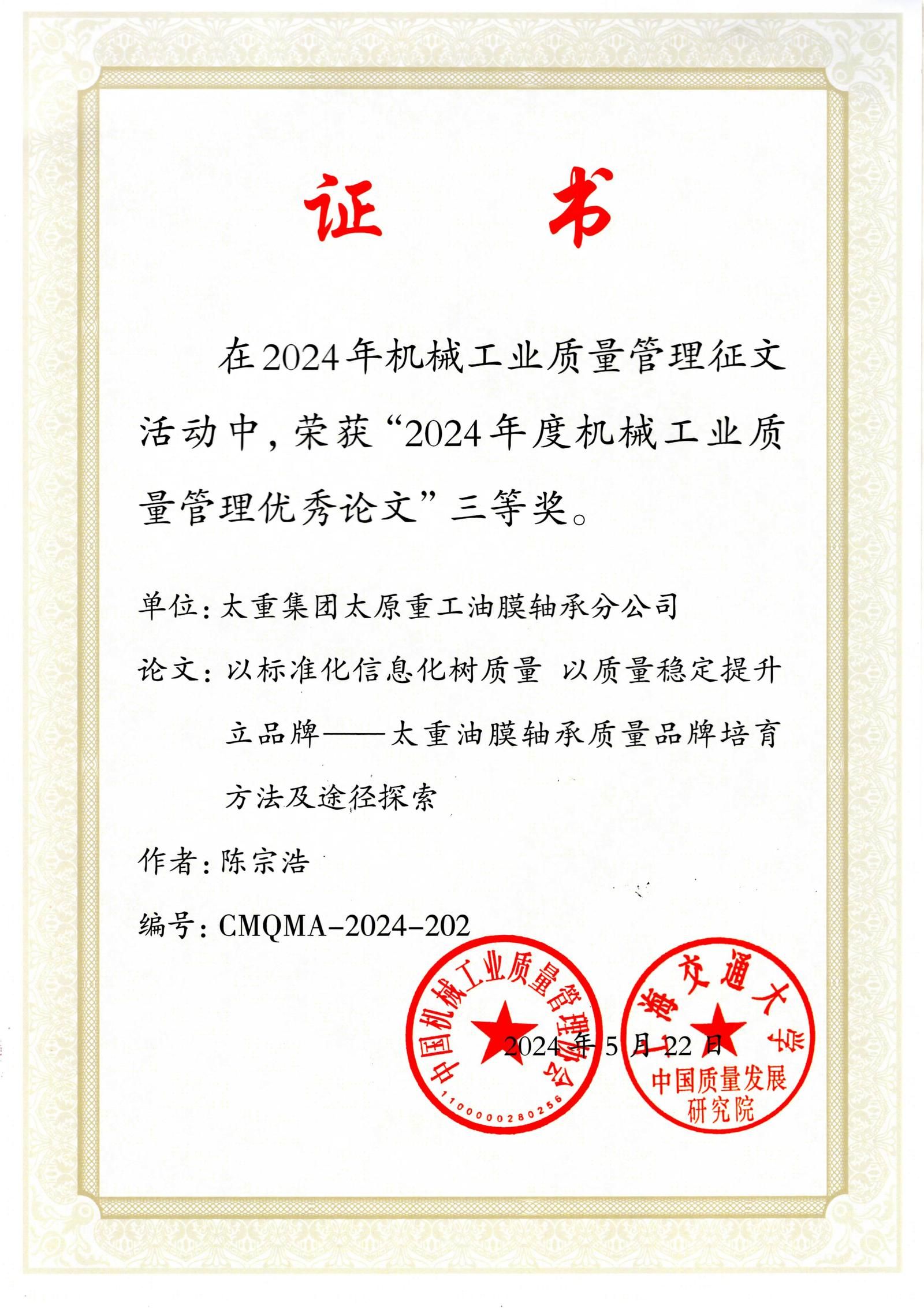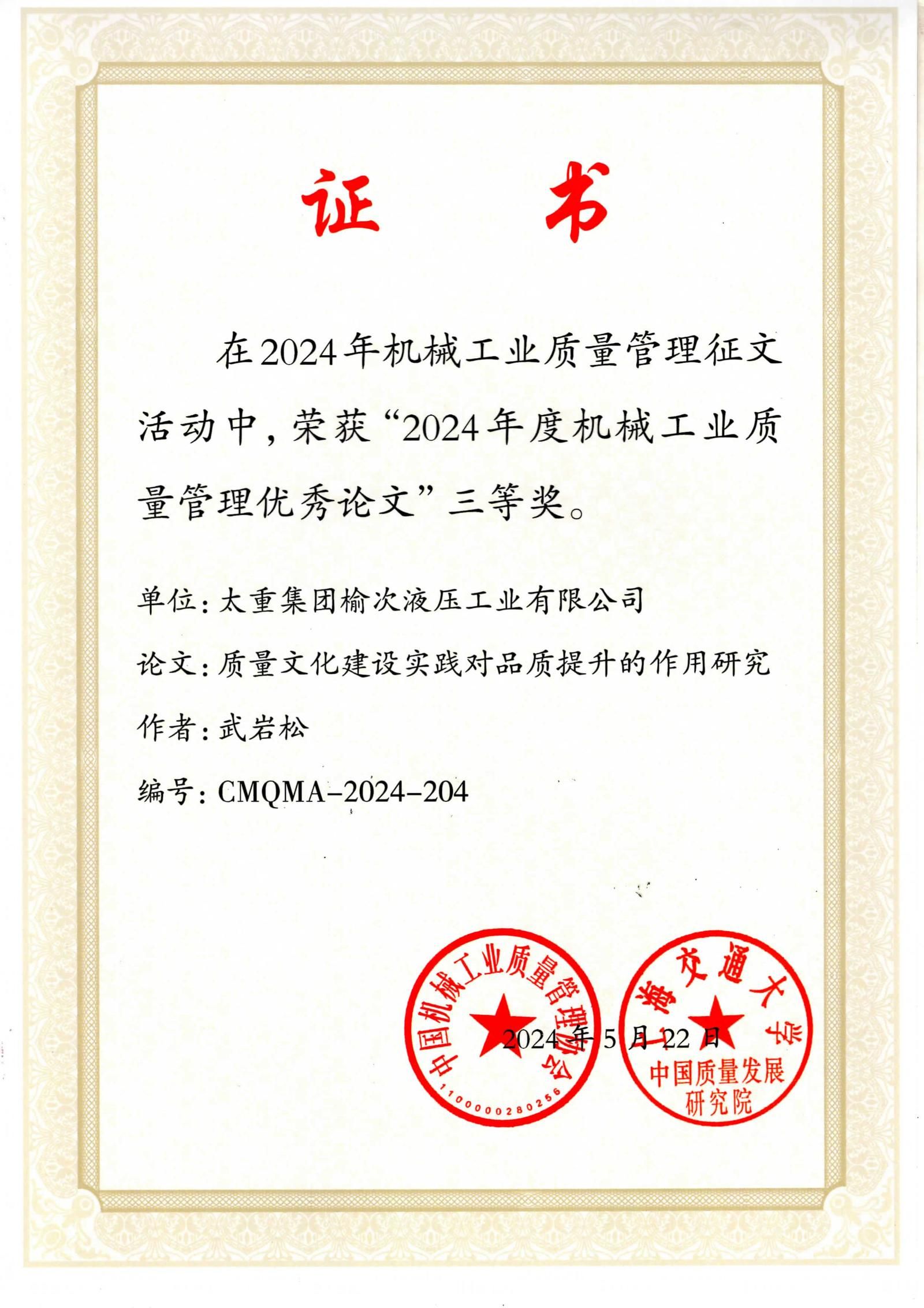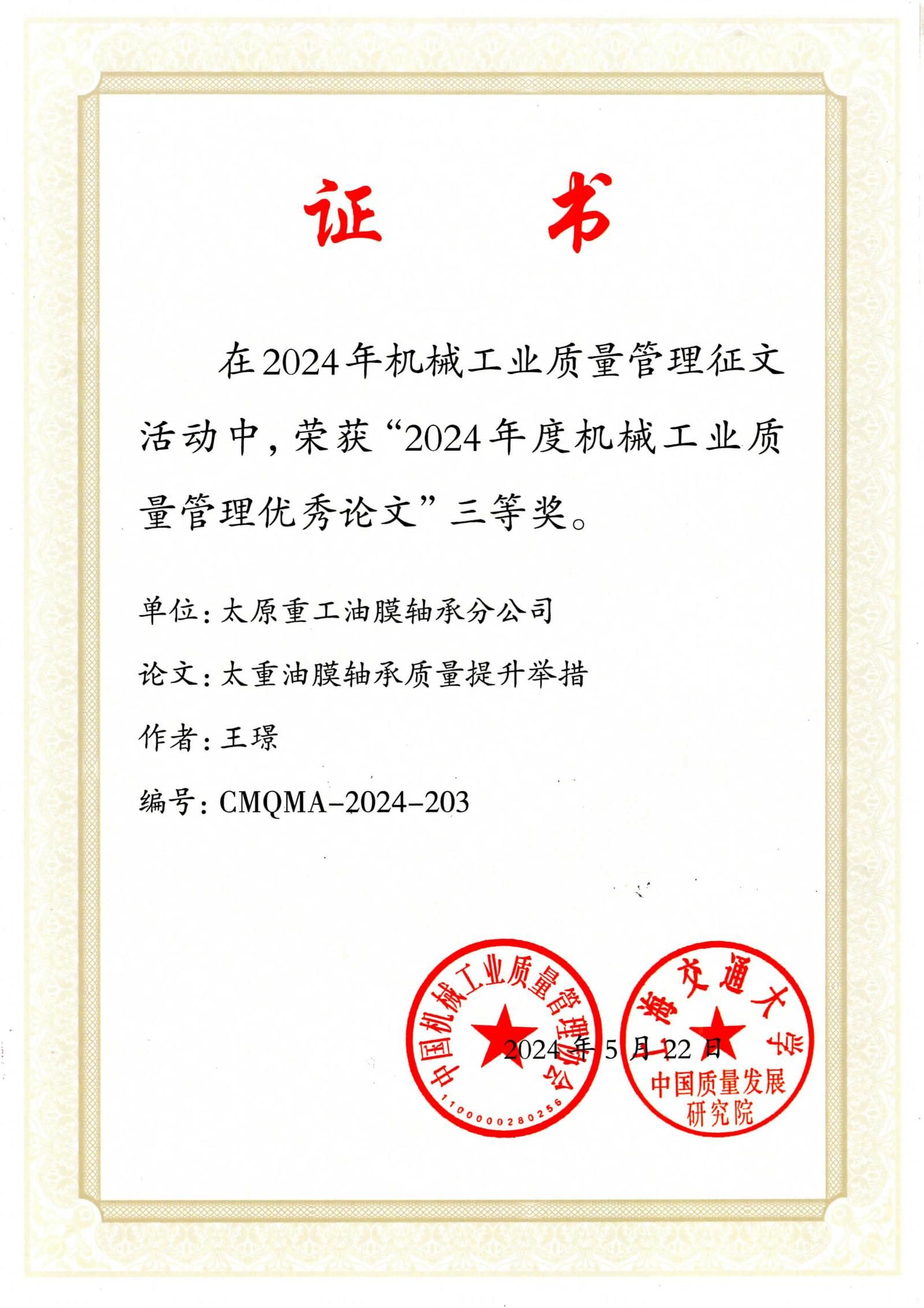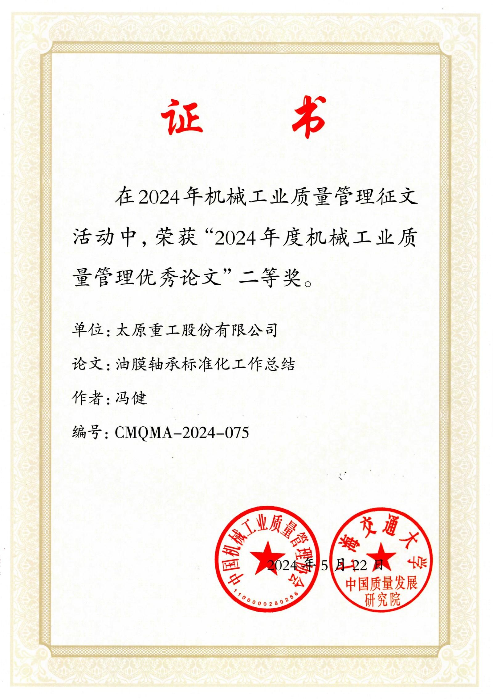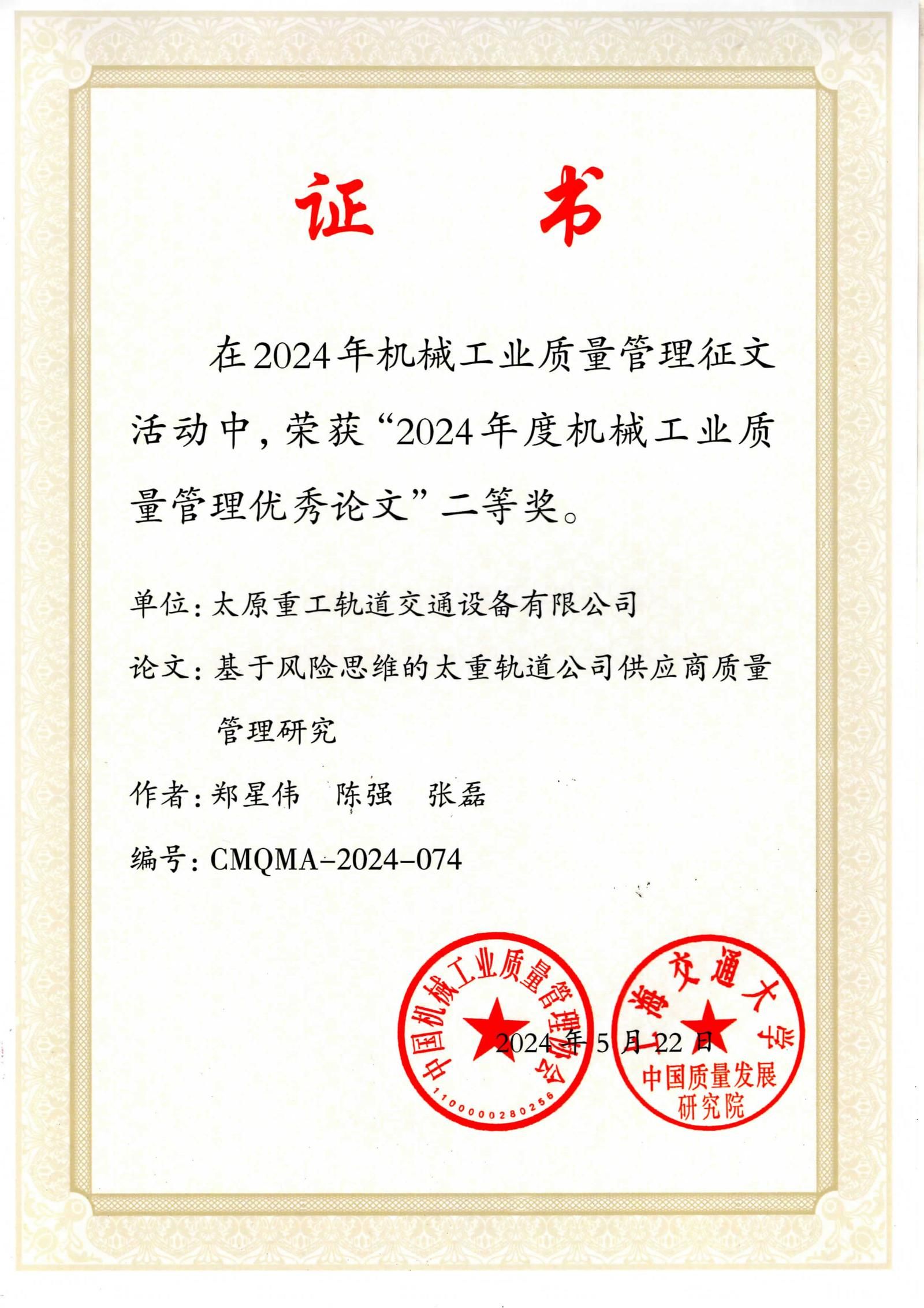 本次優(yōu)秀論文評選由業(yè)內(nèi)知名專家組成評審團,從創(chuàng)新性、實用性、影響力等多個維度進行綜合評價,旨在挖掘并推廣機械工業(yè)質(zhì)量管理領(lǐng)域的前沿理念和成功經(jīng)驗。該獎項申報門檻高、評審標(biāo)準(zhǔn)嚴,代表了行業(yè)領(lǐng)先水平。公司在此次評選中滿載而歸、碩果累累,是太重雄厚質(zhì)量管理能力的有力見證,也折射出太重質(zhì)量工作者潛心鉆研、追求卓越的創(chuàng)新精神。