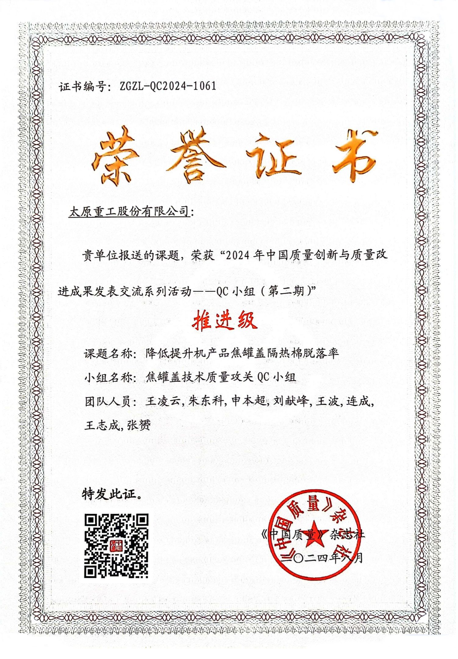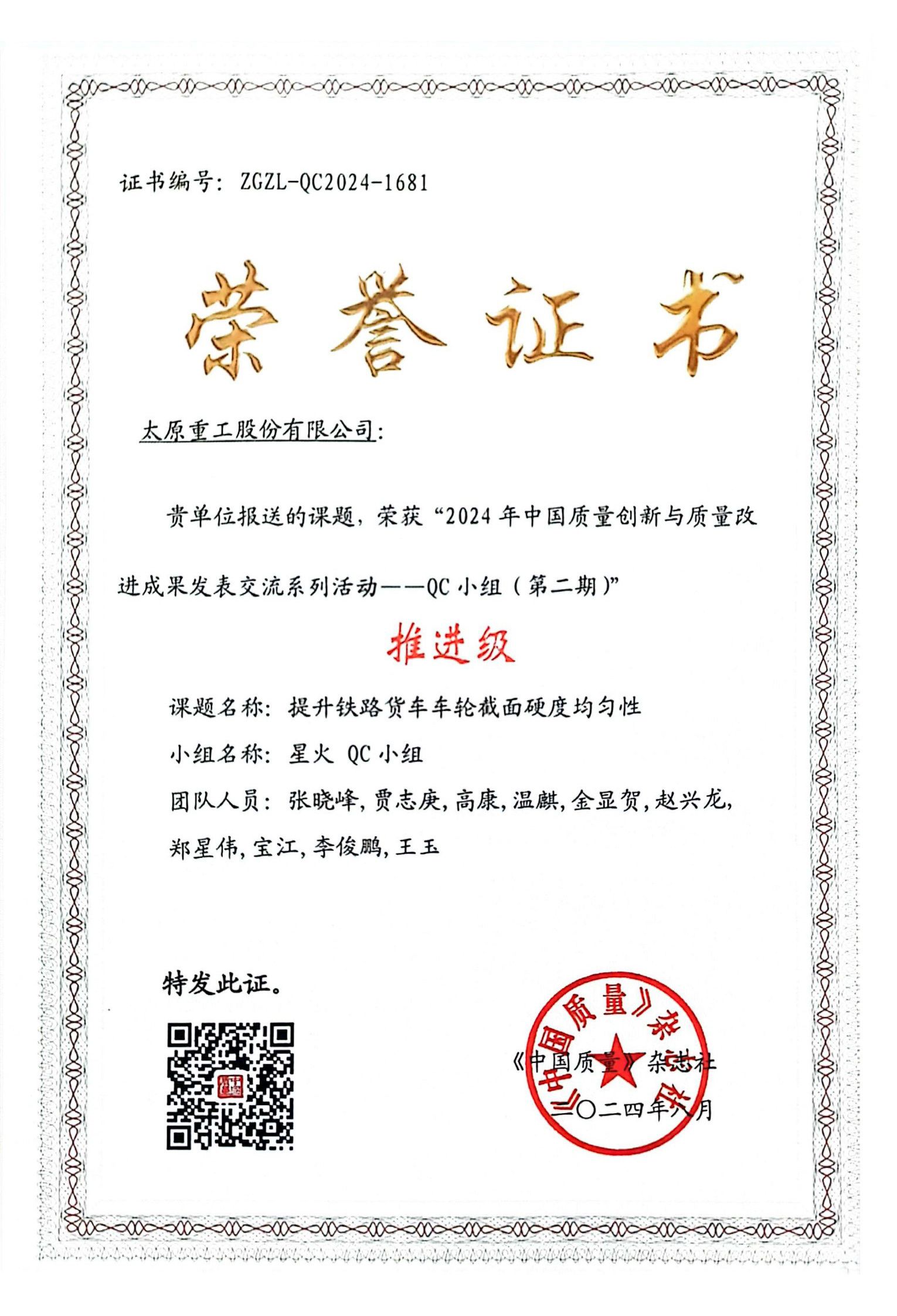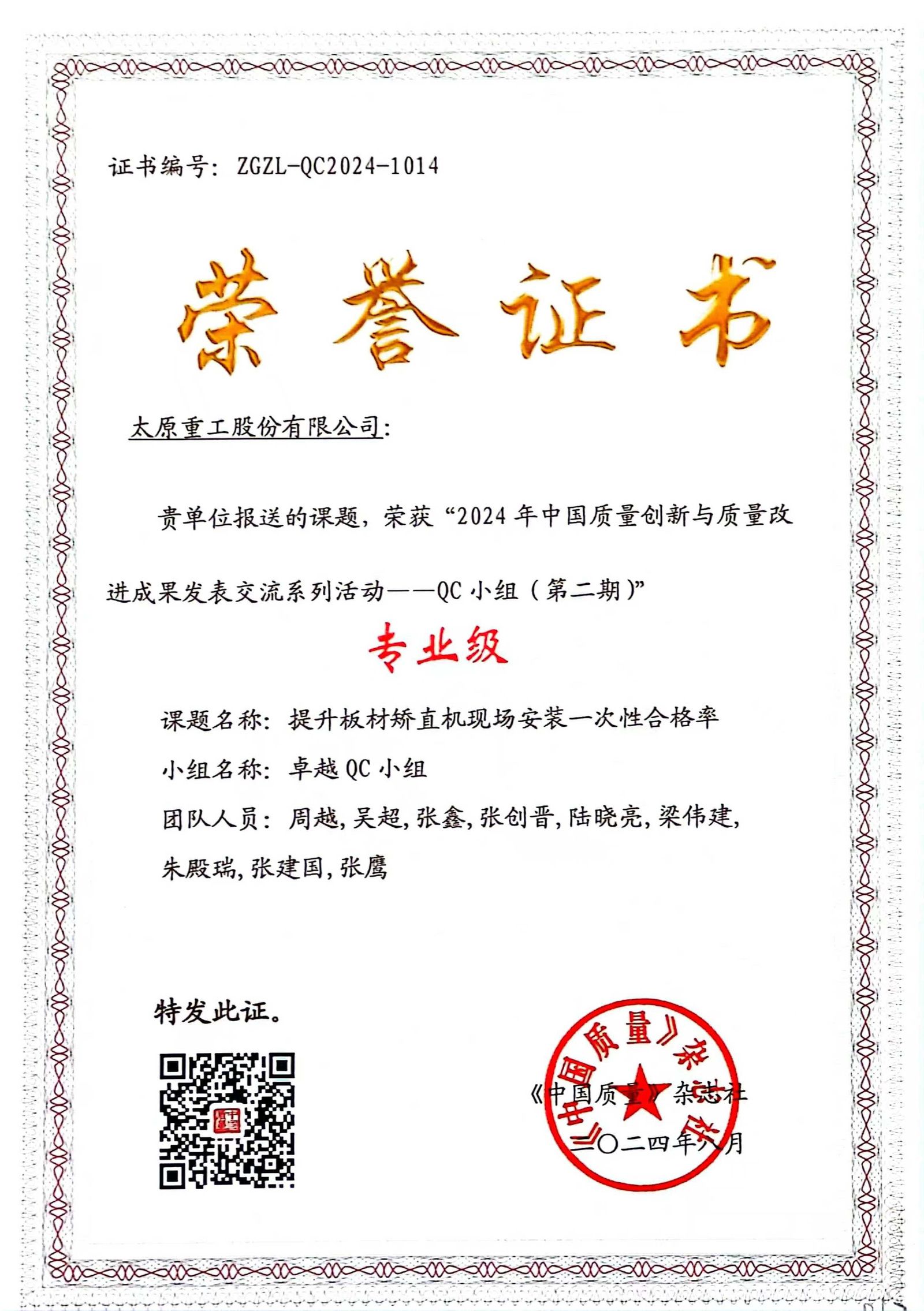 成績肯定過去,未來任重道遠(yuǎn)。公司將以本次獲獎(jiǎng)為契機(jī),再接再厲推動(dòng)質(zhì)量創(chuàng)新,依托先進(jìn)質(zhì)量工具和信息系統(tǒng),持續(xù)推進(jìn)全過程質(zhì)量管控,塑造追求卓越的質(zhì)量管理體系,全力打造太重標(biāo)準(zhǔn)、太重質(zhì)量、太重品牌,為加快培育和發(fā)展新質(zhì)生產(chǎn)力、推進(jìn)新型工業(yè)化貢獻(xiàn)更多“太重精品”。