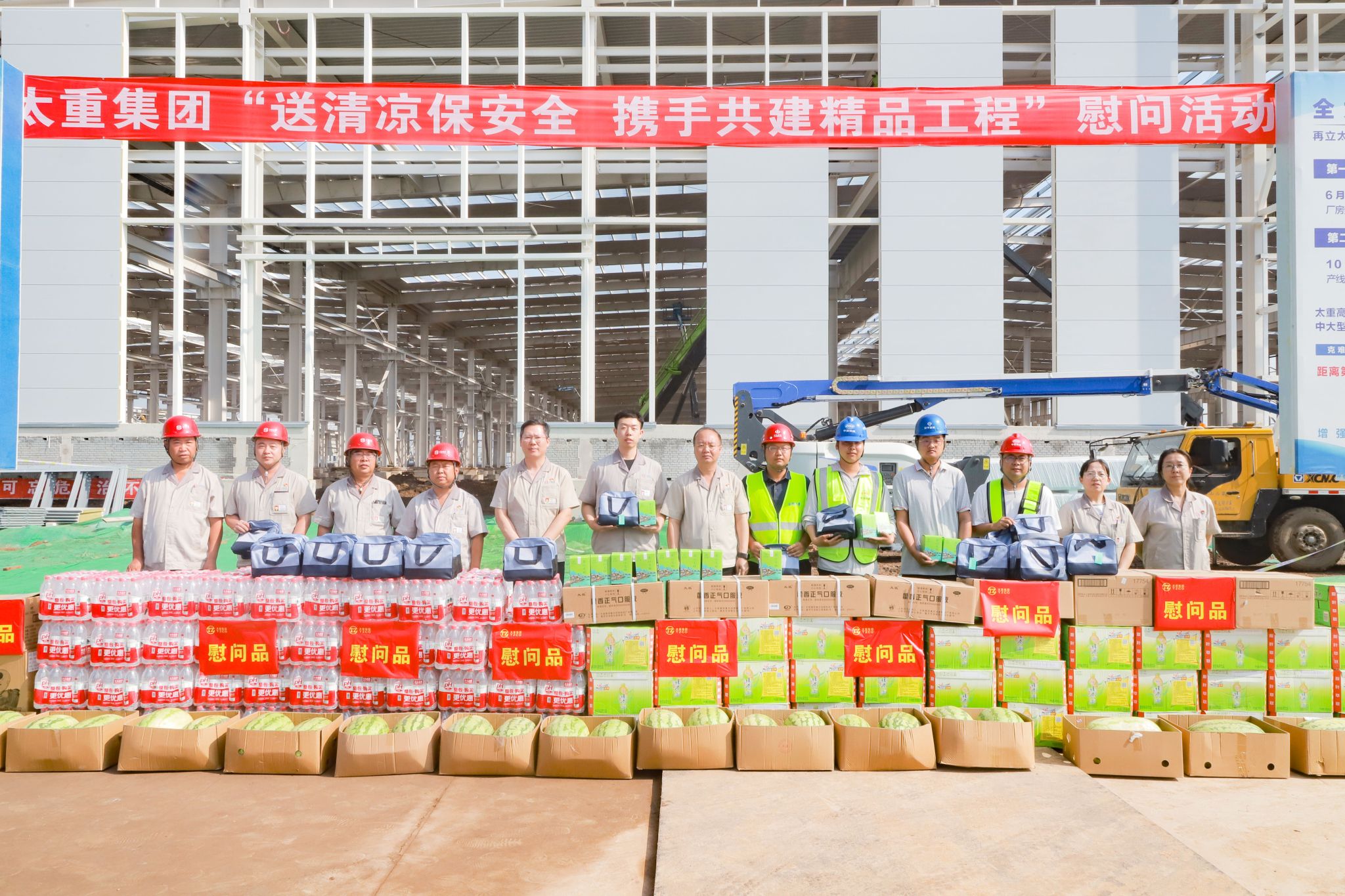 當(dāng)前,公司將工程項目建設(shè)作為推動高質(zhì)量高速度發(fā)展的“強(qiáng)引擎”和“硬支撐”,加速推進(jìn)了一批有影響、有實力的工程項目,各項目組緊盯目標(biāo),戰(zhàn)盛夏、斗酷暑,搶進(jìn)度、重安全,不畏困難、奮勇拼搏,有條不紊地推進(jìn)項目建設(shè)工作。為了表達(dá)集團(tuán)公司對項目一線參建職工的關(guān)懷與感謝,把濃濃的關(guān)心關(guān)愛傳遞到一線職工的身邊,慰問組一行先后深入工程起重機(jī)、四輪一帶、工程齒輪箱、全國重點實驗室等項目,為在高溫下堅守崗位的一線職工送去洗漱包、飲品、藥品、西瓜等清涼大禮包。活動期間,慰問組一行詳細(xì)了解現(xiàn)場作業(yè)情況及項目部安全措施落實情況,確保職工在高溫作業(yè)中的安全與健康,要求項目建設(shè)責(zé)任部門要時刻關(guān)注高溫施工及汛期安全,自覺強(qiáng)化安全意識,堅決杜絕違章作業(yè),及時消除安全隱患;要緊盯項目建設(shè)時間節(jié)點,搶抓施工黃金期,在保證質(zhì)量和安全的前提下,全力推動項目建設(shè)提速增效。