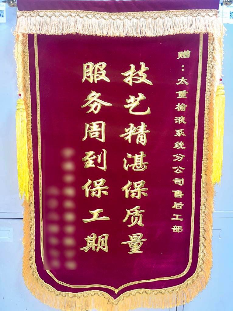 優(yōu)質(zhì)服務(wù)及時雨,鮮亮錦旗表心意。面對用戶生產(chǎn)現(xiàn)場的突發(fā)狀況,為了盡可能降低損失、保障用戶盡快復(fù)產(chǎn),太重榆液售后服務(wù)團隊立即響應(yīng),奔赴用戶現(xiàn)場進行實地勘察和技術(shù)分析,以最快的速度排查問題、解決問題,最大程度減小生產(chǎn)線停機對用戶造成的損失。用戶豎起大拇指說道:“太重的服務(wù)杠杠的!”
