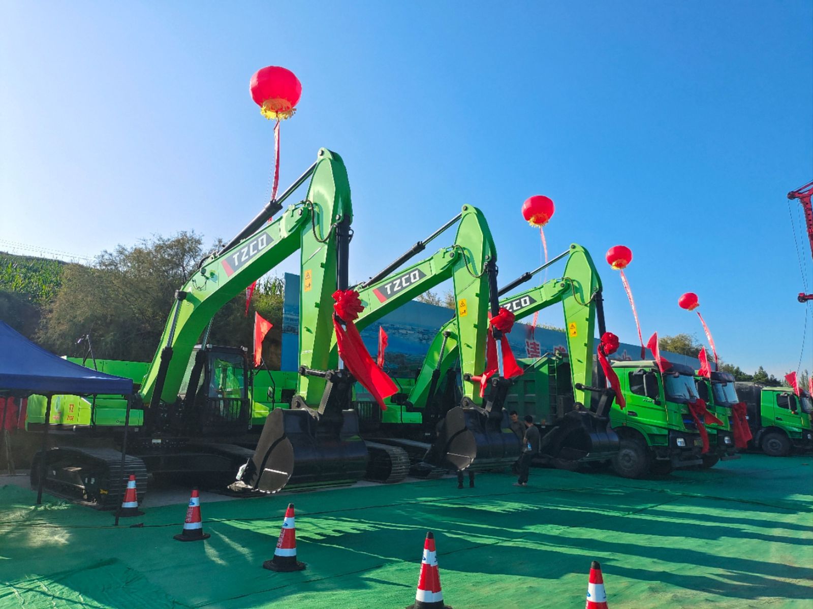 清風送爽,丹桂飄香。近日,在山西忻州省道新建工程項目開工儀式現(xiàn)場,多臺太重電動液壓挖掘機TZ270E整齊列隊、蓄勢待發(fā)?,F(xiàn)場燈籠高掛、條幅飄揚,一片喜慶的中國紅中,幾抹清新的“太重綠”點綴其間,在藍天白云的映襯下顯得格外亮眼。
