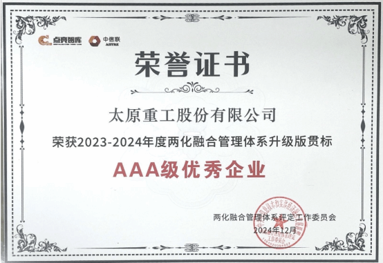 近日,太原重工股份有限公司成功獲評2023-2024年度兩化融合管理體系升級貫標(biāo)AAA級優(yōu)秀企業(yè),成為山西裝備制造業(yè)首家被工業(yè)和信息化部認(rèn)可的國家兩化融合管理體系A(chǔ)AA級的企業(yè),標(biāo)志著公司成為行業(yè)前列乃至全國領(lǐng)先的兩化融合管理示范標(biāo)桿。