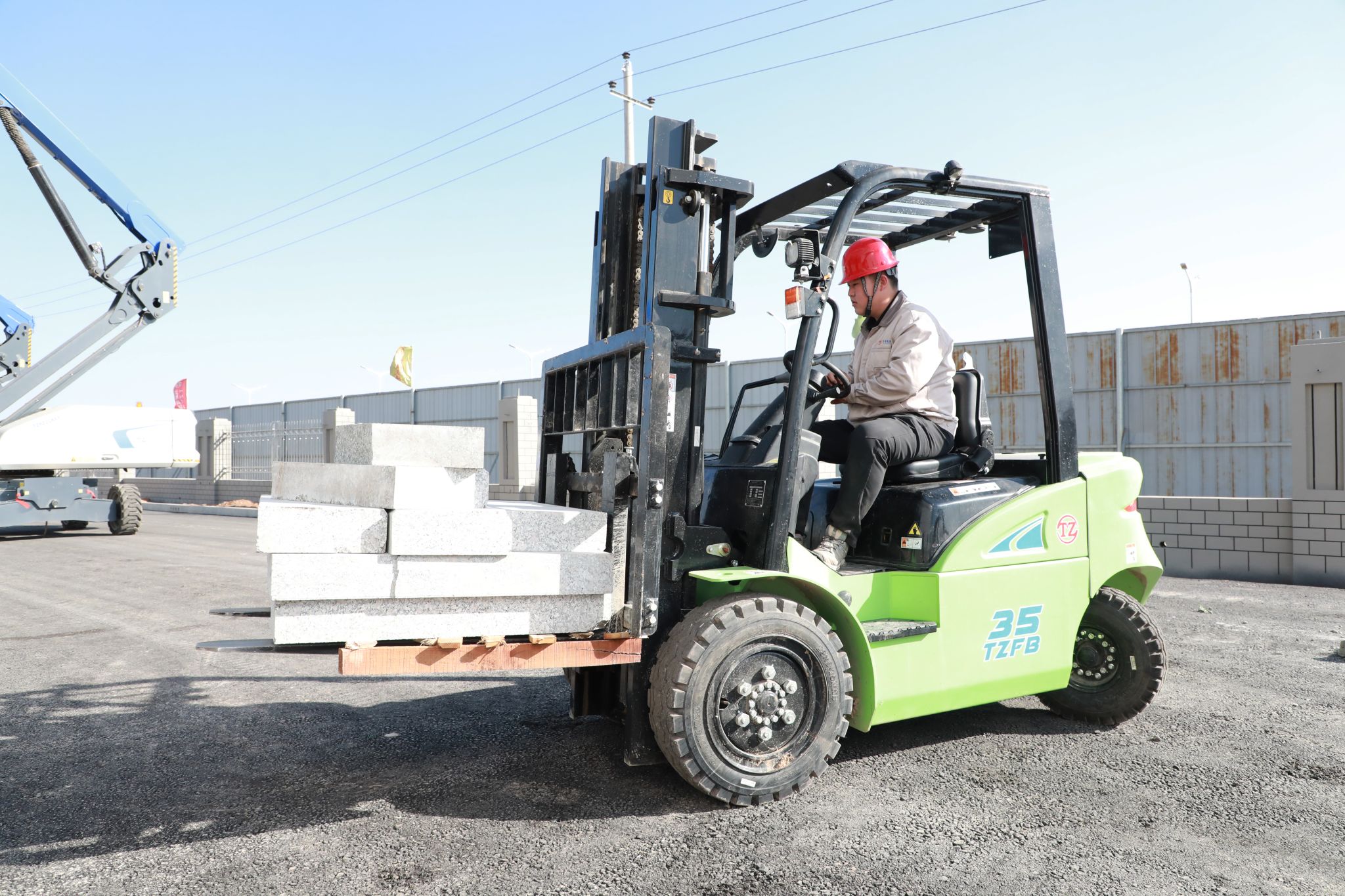 在這片機(jī)械轟鳴、車輛往來穿梭的忙碌工地上,一臺臺通體鮮綠的鋰電平衡重叉車格外醒目——這是公司自主研發(fā)的3.5噸新能源叉車,此刻正執(zhí)行路緣石轉(zhuǎn)運(yùn)任務(wù)。操作員精準(zhǔn)操控著叉臂,貨叉穩(wěn)穩(wěn)嵌入路緣石底部托盤,隨著液壓桿伸縮,近一米長的青灰色石料被平穩(wěn)托起。后輪轉(zhuǎn)向系統(tǒng)讓它們在狹窄空間游刃有余,在擺尾時(shí)劃出利落弧線,整車如游魚般輕盈轉(zhuǎn)向。工人笑著稱贊道:“這車好啊,是我開過最靈活的!”