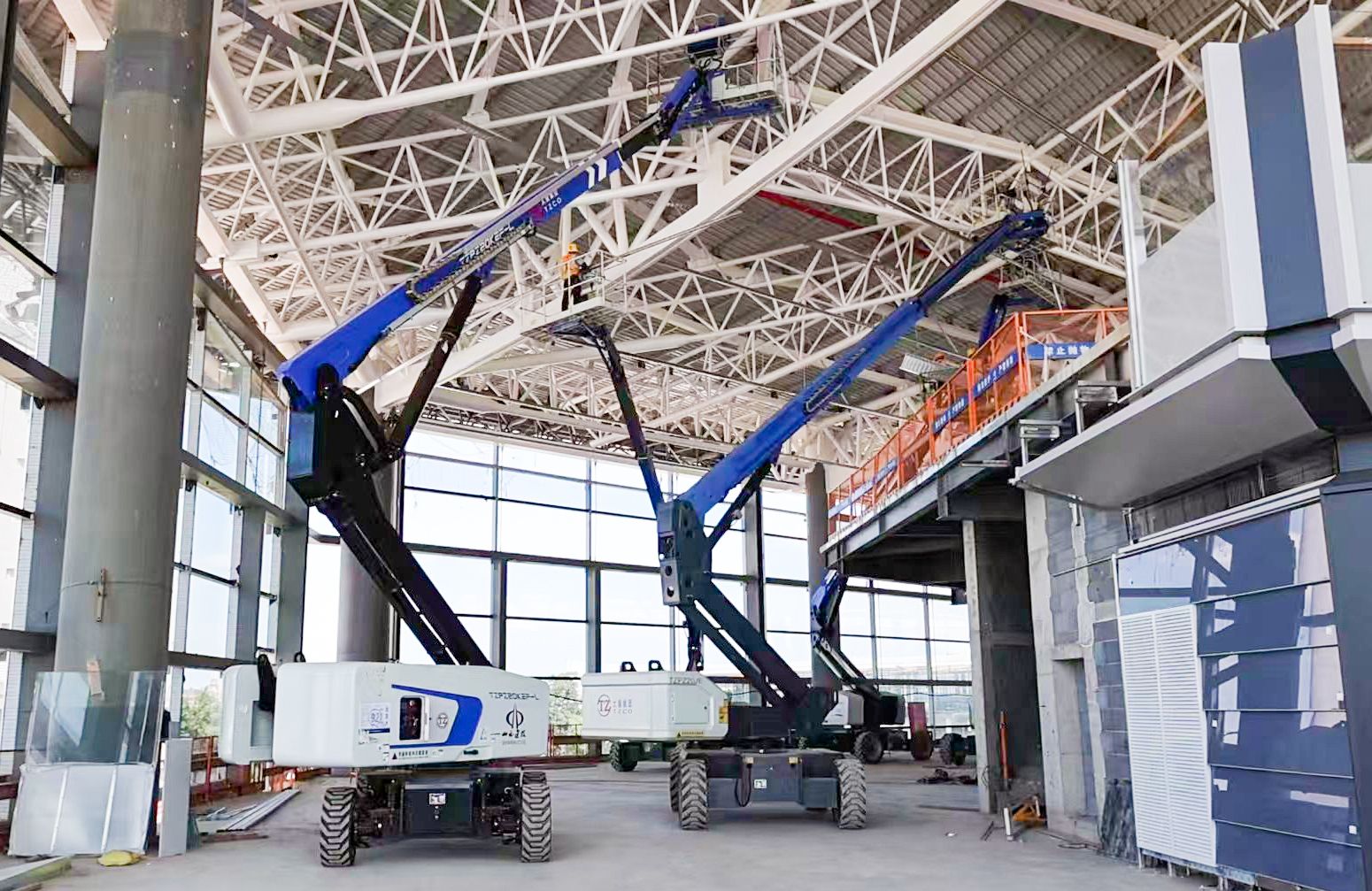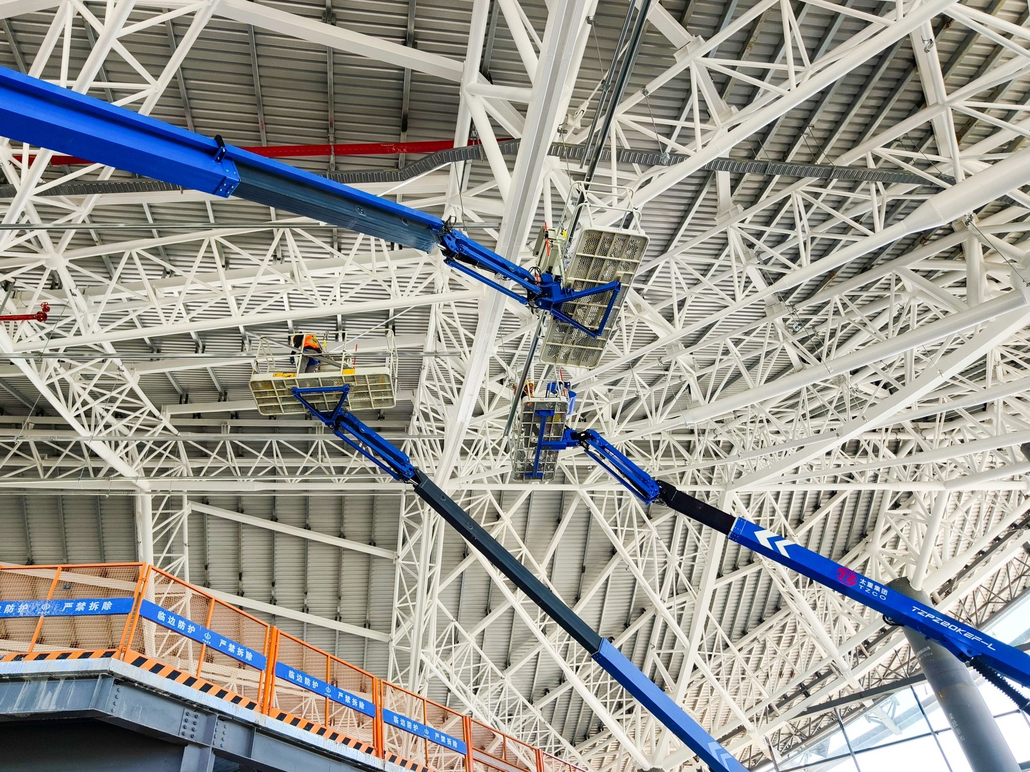 試飛成功的同時,武宿機(jī)場T3航站樓建設(shè)也在穩(wěn)步推進(jìn),60余臺印著“TZ”標(biāo)識的高空作業(yè)平臺已成為這里的“建設(shè)主力”,在東、西、中指廊區(qū)域有序作業(yè)。