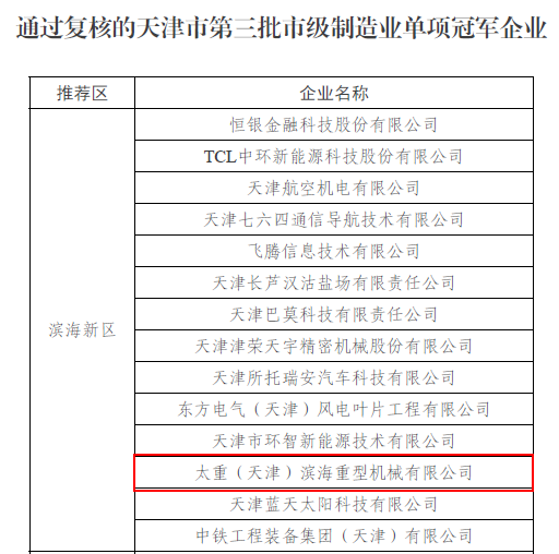 近日,天津市工業(yè)和信息化局正式公布了通過(guò)復(fù)核的第三批市級(jí)制造業(yè)單項(xiàng)冠軍企業(yè)名單。憑借持續(xù)的技術(shù)創(chuàng)新和行業(yè)優(yōu)勢(shì)地位,太重濱海公司成功通過(guò)復(fù)核,再次獲“單項(xiàng)冠軍”稱號(hào)。