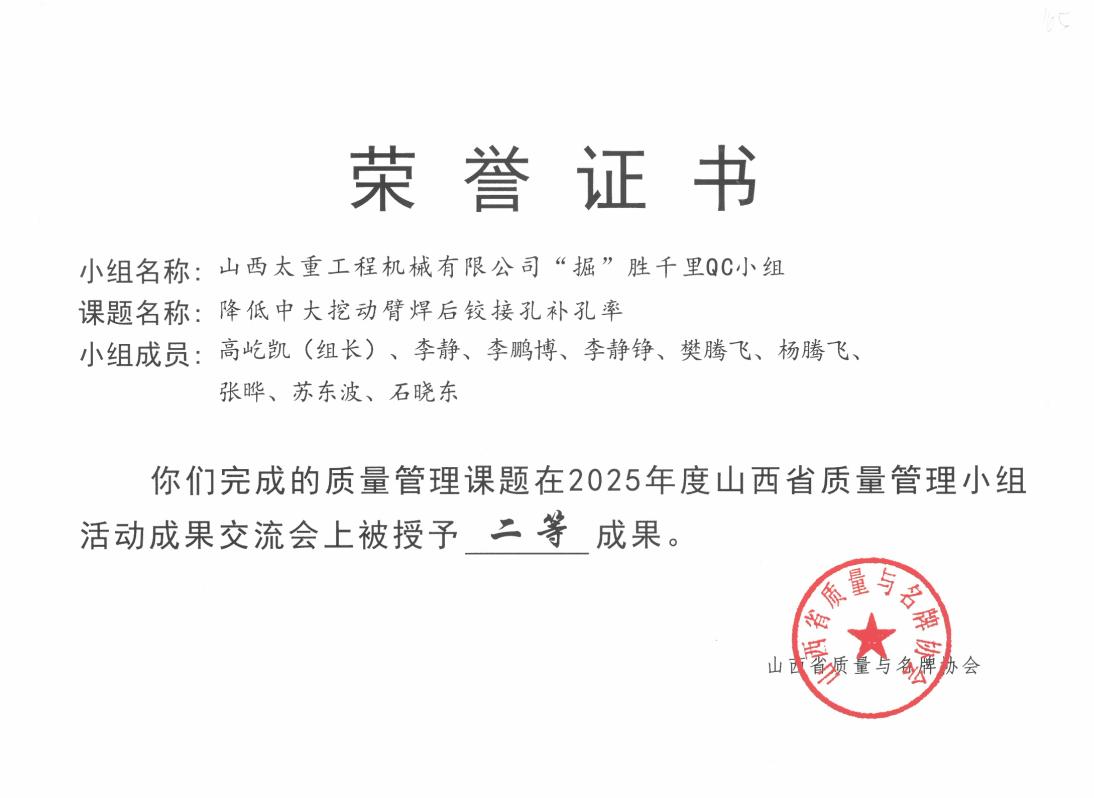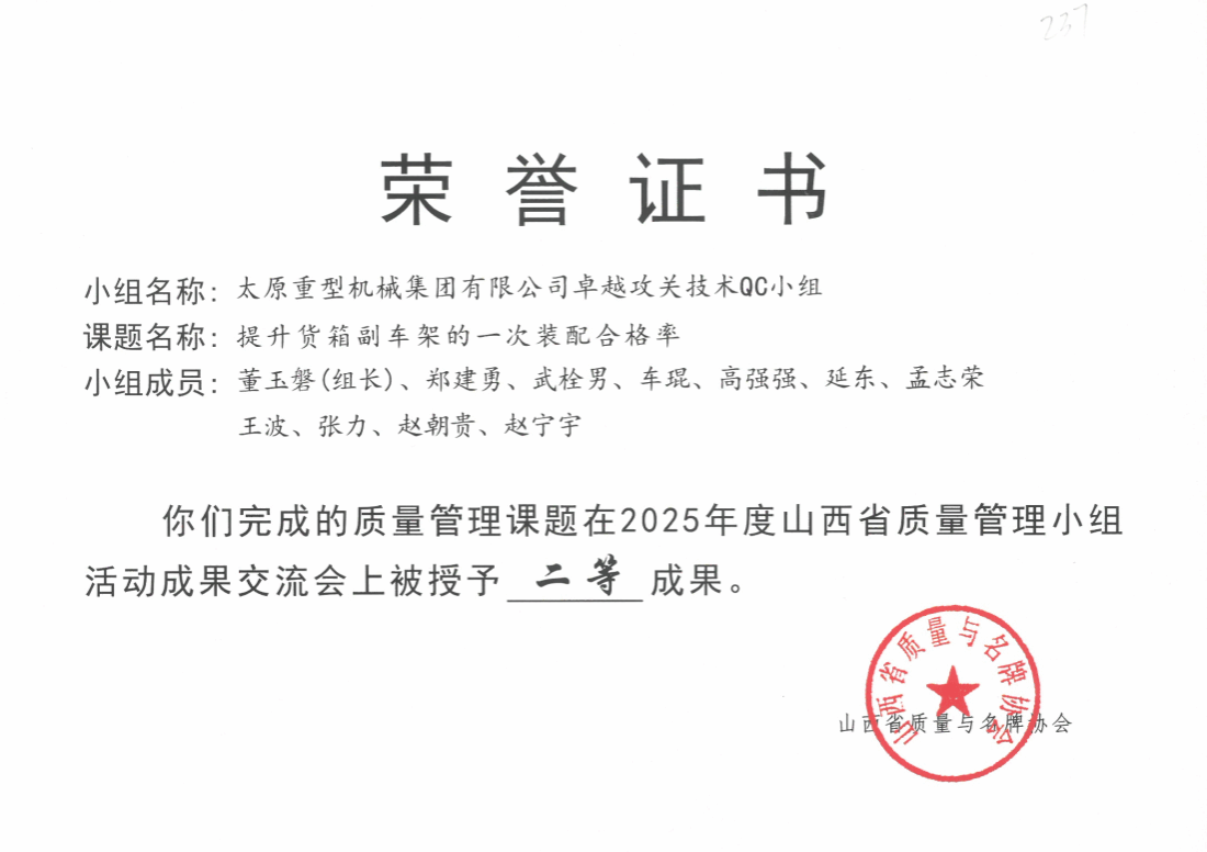 此外,還有太重榆液《提升真空泵定子合格率》、工程機械公司《降低中大挖動臂焊后鉸接孔補孔率》、油膜分公司《襯套加工效率提升的裝置研制》、焦化公司《提升貨箱副車架的一次裝配合格率》四個項目榮獲全省二等成果。