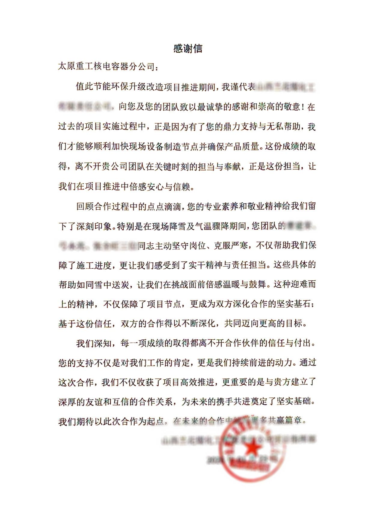 “堅(jiān)守崗位、克服嚴(yán)寒,讓我們感受到了實(shí)干精神與責(zé)任擔(dān)當(dāng)?!苯?,太重核電分公司收到來(lái)自用戶的感謝信。字里行間,點(diǎn)贊滿滿,對(duì)在尾氣洗滌塔施工項(xiàng)目中,展現(xiàn)敬業(yè)精神的太重制造團(tuán)隊(duì)高度贊揚(yáng)。