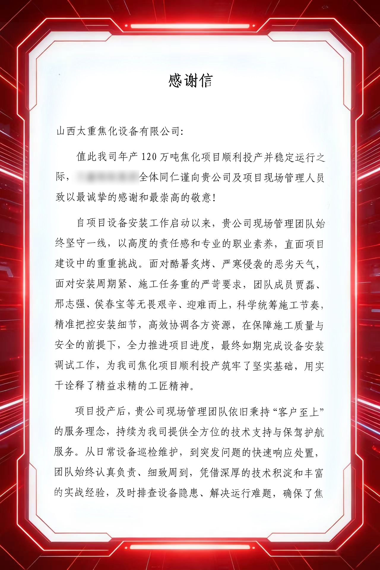 “過硬專業(yè)能力、頑強(qiáng)拼搏的工作作風(fēng)和貼心細(xì)致的服務(wù)態(tài)度,讓我們深受感動(dòng)。”近日,某大型鋼鐵集團(tuán)在發(fā)給太重的感謝信中,用這樣一段話,對太重焦化公司現(xiàn)場管理團(tuán)隊(duì)在年產(chǎn)120萬噸焦化項(xiàng)目建設(shè)中的責(zé)任擔(dān)當(dāng)給予高度評價(jià)。