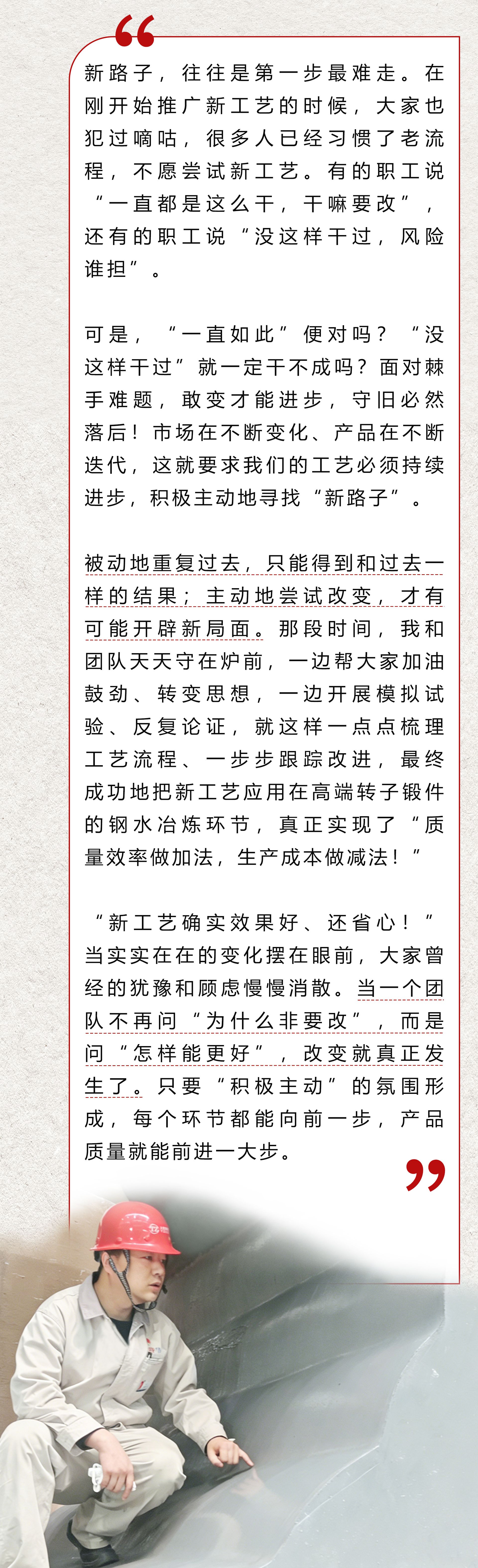 零部件強(qiáng)則整機(jī)強(qiáng),基礎(chǔ)穩(wěn)則產(chǎn)業(yè)穩(wěn)。在公司高端鑄鍛件產(chǎn)品的技術(shù)攻關(guān)之路上,鑄鍛件分公司工藝技術(shù)室靳鵬與團(tuán)隊共同推動工藝技術(shù)革新,并助力“高參數(shù)大型汽輪機(jī)轉(zhuǎn)子研發(fā)及批量化制造”項目榮獲公司科學(xué)技術(shù)獎二等獎。