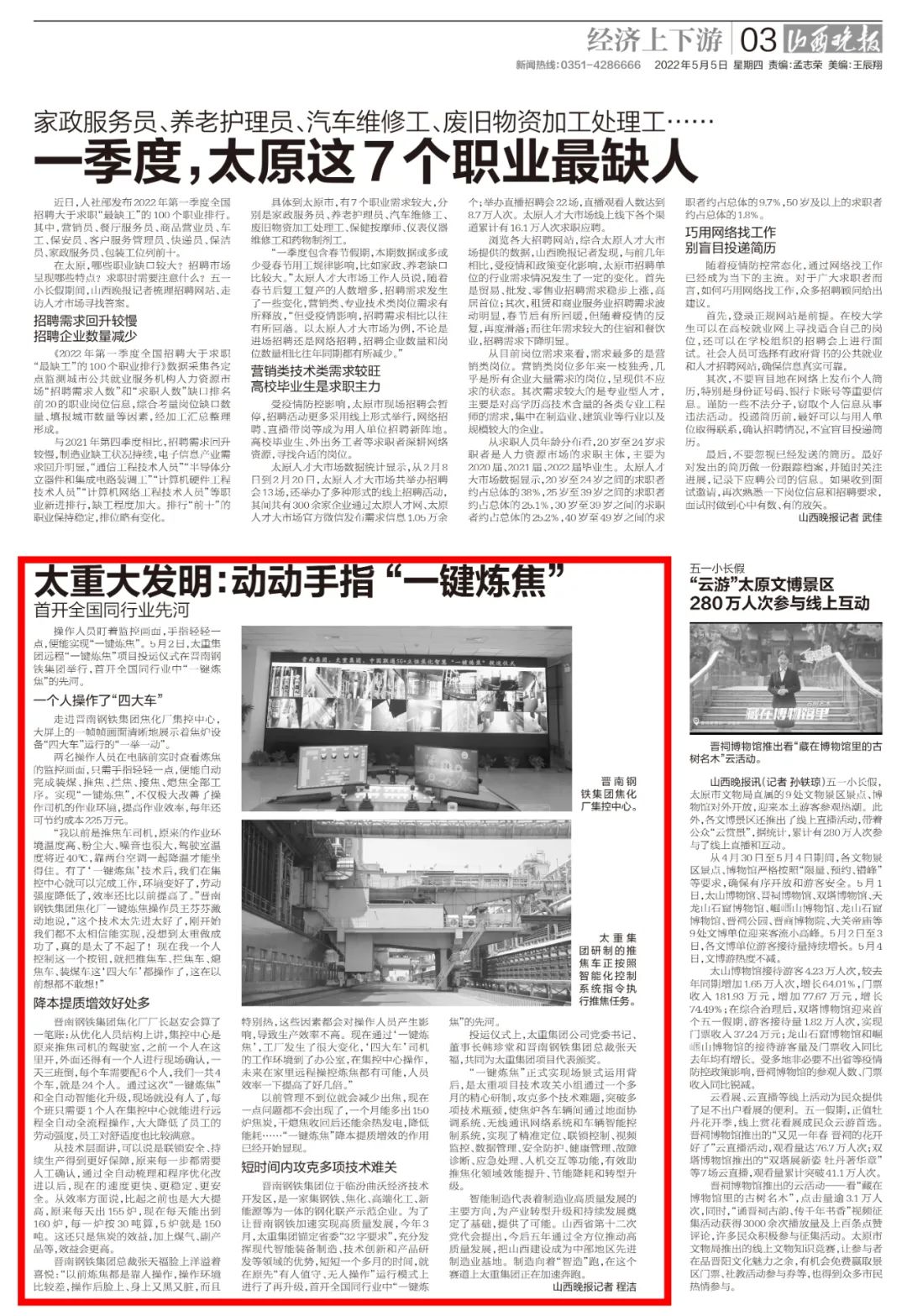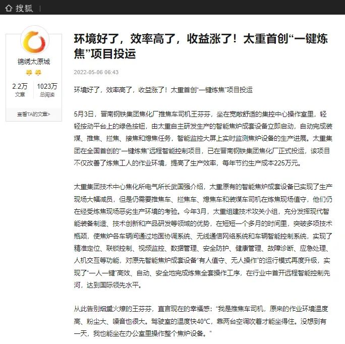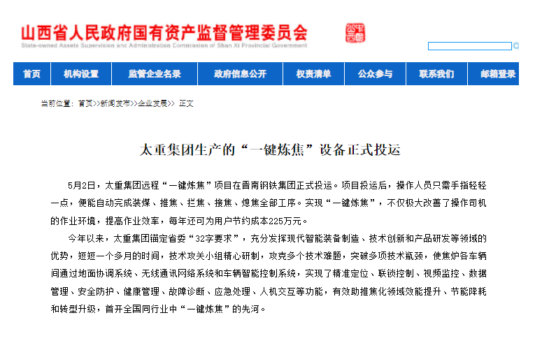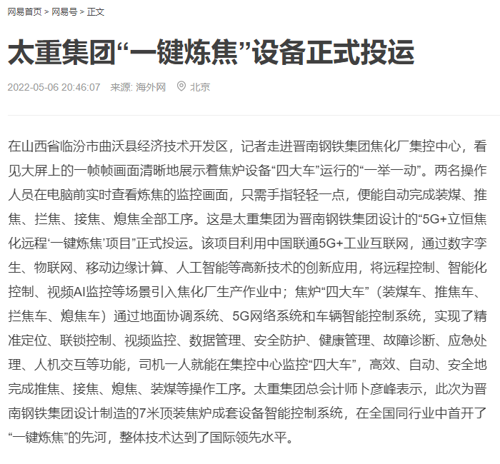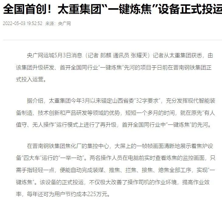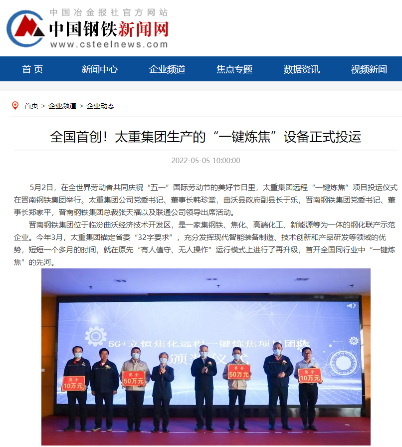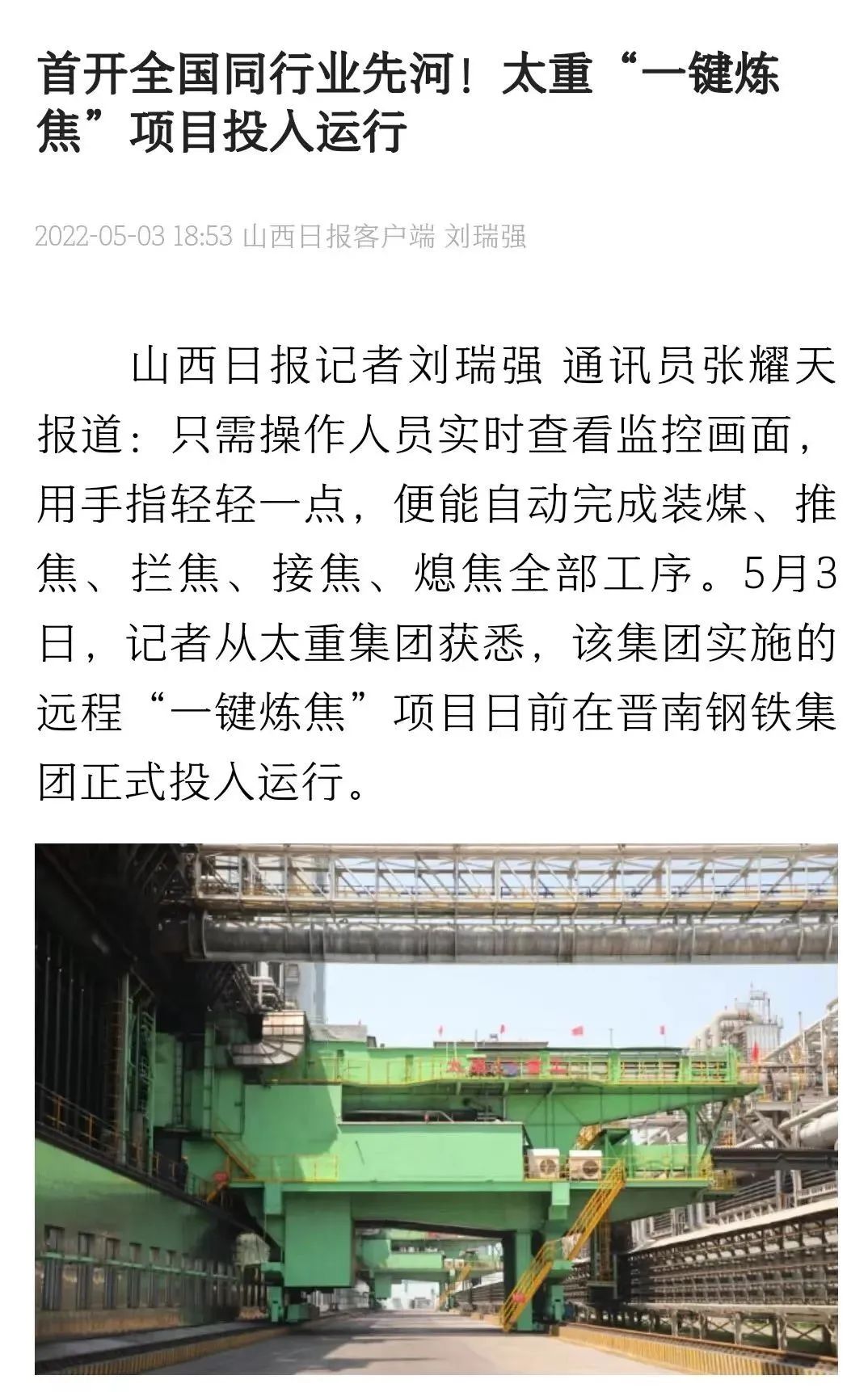 央廣網(wǎng)、中國鋼鐵新聞網(wǎng)、騰訊以《全國首創(chuàng)!太重集團“一鍵煉焦”設備正式投運》為題,聚焦太重集團以科技創(chuàng)新激發(fā)“智造”新活力為出發(fā)點,全面展示“智能+5G”在“一鍵煉焦”上的應用,助力焦化領域效能提升、節(jié)能降耗和轉型升級。中國經(jīng)濟網(wǎng)、網(wǎng)易、山西國資以《太重集團“一鍵煉焦”設備正式投運》為題,報道太重集團“一鍵煉焦”項目正式開啟智能煉焦新時代,填補技術空白,開創(chuàng)國內焦化行業(yè)先河。搜狐網(wǎng)以《環(huán)境好了,效率高了,收益漲了!太重首創(chuàng)“一鍵煉焦”項目投運》為題,重點展示了太重集團“一鍵煉焦”項目成果,實現(xiàn)智能綠色工廠轉型再升級。山西日報、山西晚報、太原日報分別以《首開全國同行業(yè)先河!太重“一鍵煉焦”項目投入運行》《太重大發(fā)明:動動手指“一鍵煉焦”》《太重首創(chuàng)“一鍵煉焦”項目投運》為題,聚焦太重“智造”再提速,充分展現(xiàn)公司以“三性五化”為新產(chǎn)品開發(fā)目標,助力國家實現(xiàn)“雙碳”目標。