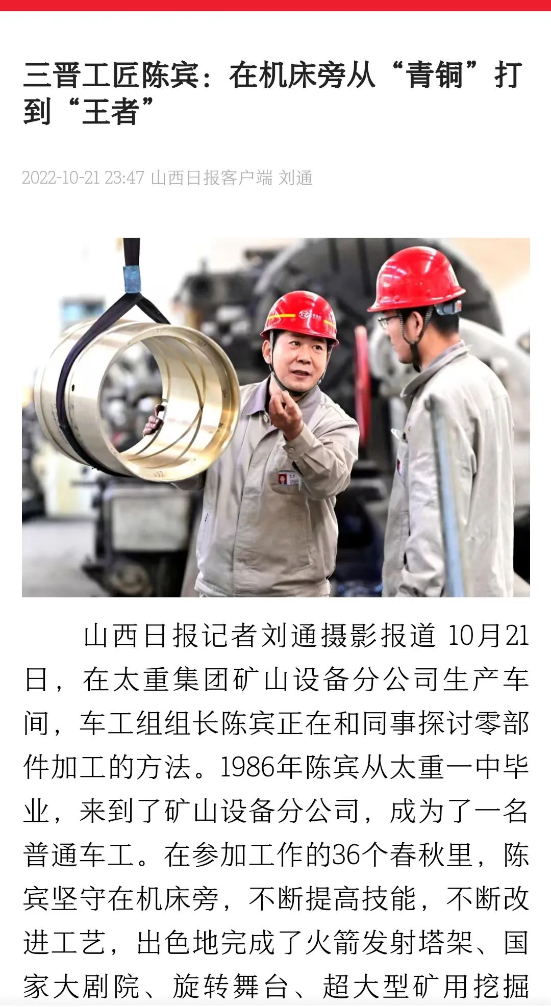 10月21日,山西日?qǐng)?bào)以《三晉工匠陳賓:在機(jī)床旁從“青銅”打到“王者”》為題,對(duì)太重職工陳賓進(jìn)行了報(bào)道。陳賓36年來(lái)潛心鉆研、不斷創(chuàng)新、精益求精,致力于大型關(guān)鍵零件的精加工任務(wù),成為一名名副其實(shí)的“三晉工匠”。