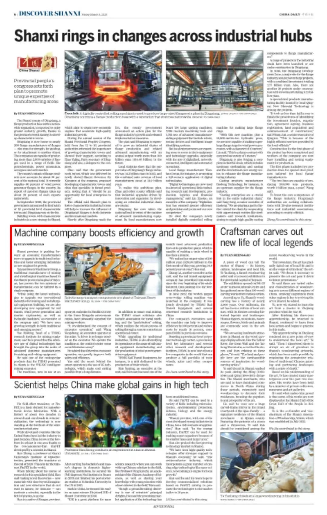 今日,中國(guó)日?qǐng)?bào)全英文刊發(fā)《Machine company boosts efficiency and growth》文章,報(bào)道太重集團(tuán)立足公司產(chǎn)業(yè)優(yōu)勢(shì),聚焦智能礦用挖掘機(jī)、軌道交通等領(lǐng)域,推進(jìn)智能設(shè)計(jì)、智能制造、智能產(chǎn)品、智能服務(wù),持續(xù)提升重型裝備制造業(yè)的技術(shù)含量,積極在全省轉(zhuǎn)型發(fā)展中發(fā)揮龍頭帶動(dòng)作用,助力我省建設(shè)中部地區(qū)先進(jìn)制造業(yè)基地和數(shù)字經(jīng)濟(jì)發(fā)展新高地,在不斷推動(dòng)產(chǎn)業(yè)形態(tài)轉(zhuǎn)型升級(jí)中勇立新功。