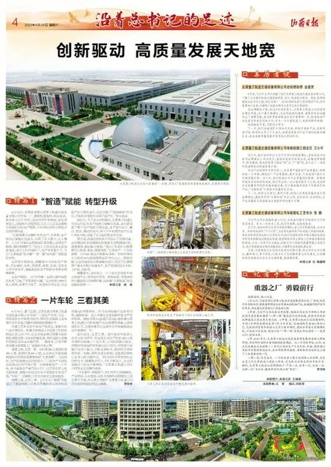 6月24日,山西日報頭版及四版整版多篇報道紛紛聚焦太重集團,深入報道了在習近平總書記考察調(diào)研太重六年間的巨大變化。太重集團在高質(zhì)量發(fā)展的道路上蹄疾步穩(wěn),用實際行動回應(yīng)著領(lǐng)袖的殷殷囑托。作為省內(nèi)唯一“雙鏈主”企業(yè),太重不斷加大科研投入力度,在突破關(guān)鍵核心技術(shù)、促進產(chǎn)業(yè)轉(zhuǎn)型升級的最前沿業(yè)績突出,蔚然形成千帆奮競、全面創(chuàng)新的生動局面,受到了主流媒體的關(guān)注。