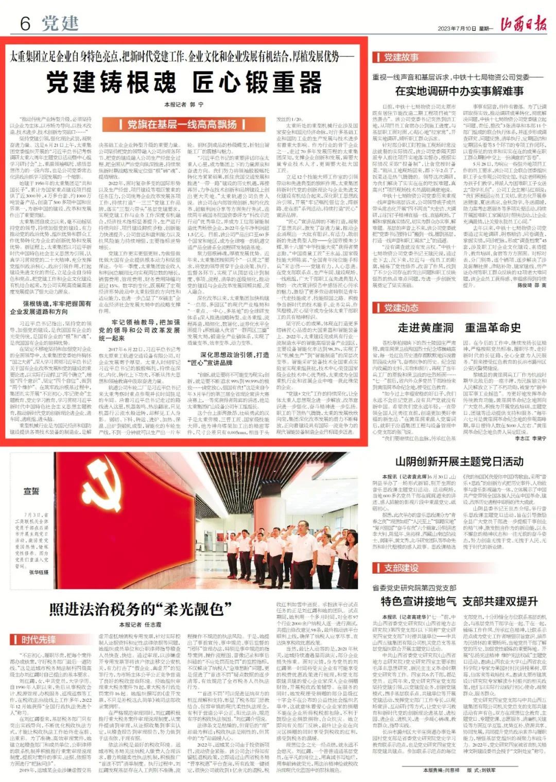 今天,山西日報刊發(fā)《黨建鑄根魂 匠心鍛重器》文章,聚焦太重集團以習近平新時代中國特色社會主義思想為指引,認真學習貫徹黨的二十大精神,充分發(fā)揮黨組織政治核心、政治引領(lǐng)作用,扛起建設(shè)先進文化的責任,立足企業(yè)自身特色和亮點,把新時代黨建工作和企業(yè)文化建設(shè)有機結(jié)合起來,實現(xiàn)高質(zhì)量高速度發(fā)展,向著建設(shè)具有國際一流競爭力的現(xiàn)代智能裝備制造企業(yè)目標闊步邁進。