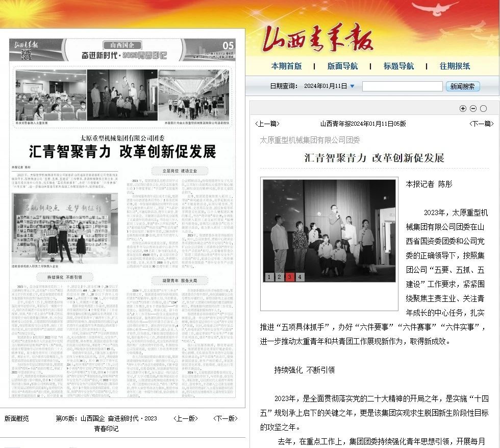 今日,山西青年報(bào)以《匯青智聚青力 改革創(chuàng)新促發(fā)展》為題,整版從“持續(xù)強(qiáng)化 不斷引領(lǐng)”“立足崗位 建功立業(yè)”“凝聚青年 服務(wù)大局”三個(gè)方面,對(duì)太重共青團(tuán)2023年工作進(jìn)行全面報(bào)道。