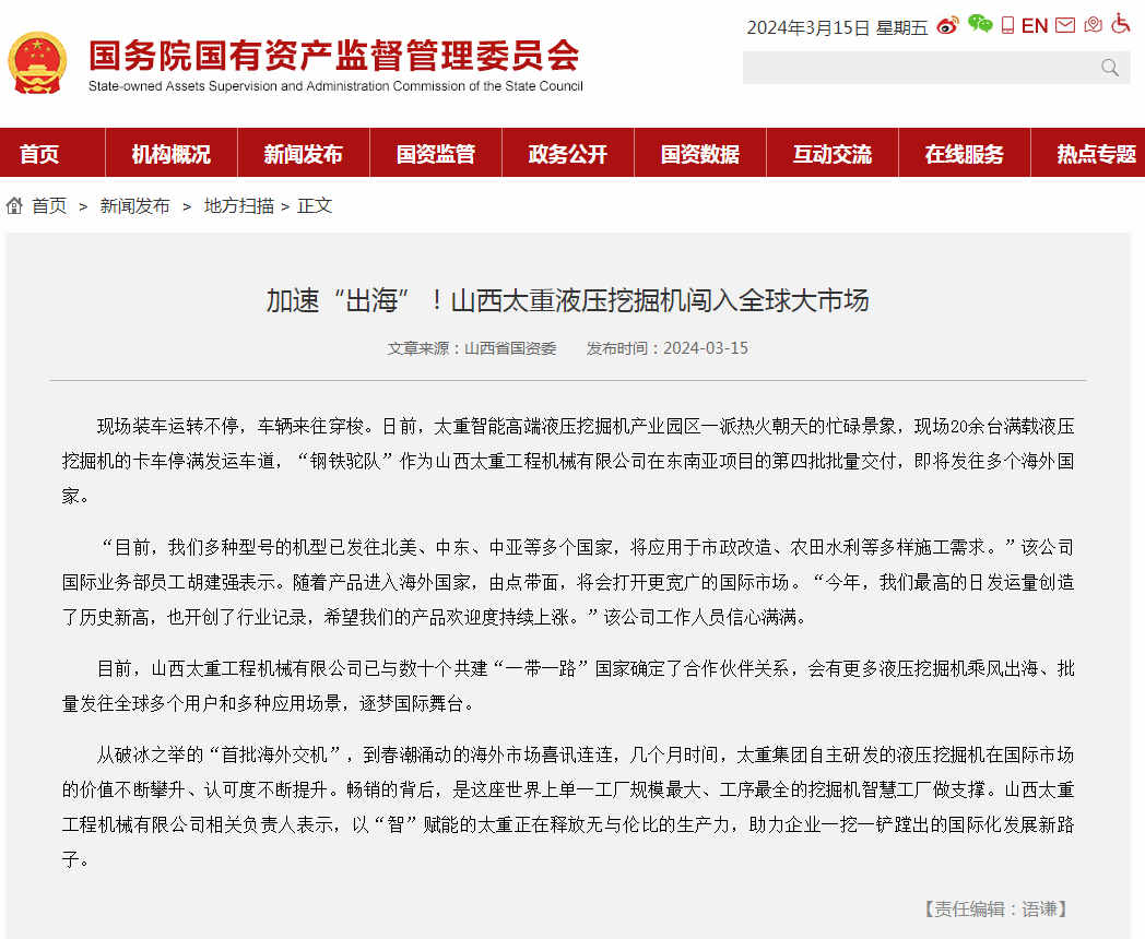 作為裝備制造業(yè)的領(lǐng)軍企業(yè),太重被格外關(guān)注,被寄予厚望。近日,國(guó)務(wù)院國(guó)有資產(chǎn)監(jiān)督管理委員會(huì)官網(wǎng)刊登了《加速“出?!?!山西太重液壓挖掘機(jī)闖入全球大市場(chǎng)》;山西新聞聯(lián)播也在《推動(dòng)高質(zhì)量發(fā)展 深化全方位轉(zhuǎn)型》欄目中對(duì)太重進(jìn)行深入報(bào)道。